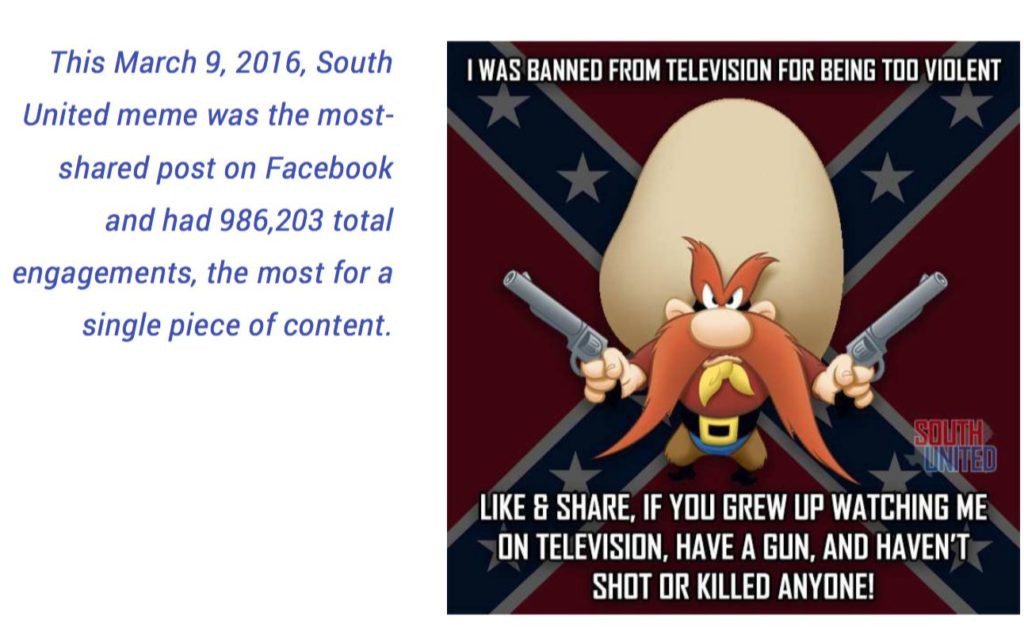• 2016年大統領選挙の内容:最も明白なデータポイントは、ロシアのソーシャルメディア活動が2016年の選挙運動に関連したのは、ごくわずかだったということだ。ニュー・ナレッジの報告書では、IRAの内容を「純粋に、決定的に選挙を揺り動かしたかどうかに基づいて」評価することは、「明白に政治的な内容がごく一部であった」ことから、「余りにも狭い焦点である」ことを認めている。正確にいうと、「全体のうち11パーセント」だけがIRAに起因するもので、それに対するユーザーの関与の33パーセントが「選挙に関連していた」。IRAの投稿は、「ツイートのおよそ6パーセント、インスタグラム投稿の18パーセント、そしてフェイスブック投稿の7パーセント」に「トランプやクリントンの名前が挙げられて」おり、「候補者についてのものはわずか」だった。