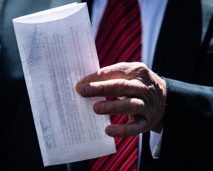 He would not show us the one-page piece of paper on the South Lawn, but sunlight illuminated part of it. H/t @brandonknappCNN pic.twitter.com/hwdV6asS5f