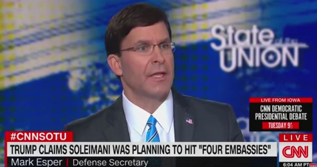 エスパー長官は「ステート・オブ・ザ・ユニオン」という番組でCNNのジェイク・タッパーと話し、大統領の立場と脅威が差し迫っていたという考えを擁護した。