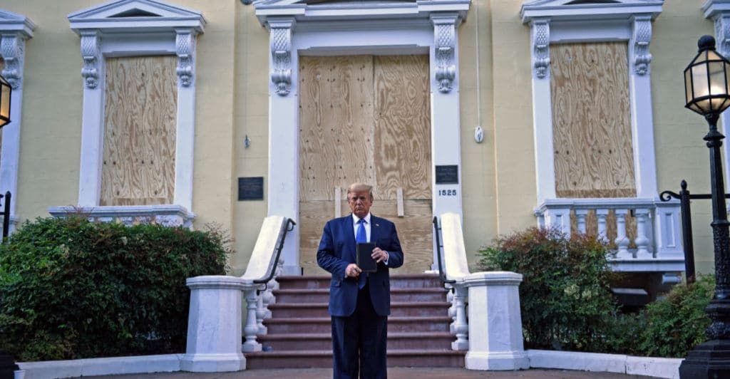 ローズガーデンでの演説の少し後、トランプは週末にかけた暴動で一部が燃えた、ホワイトハウス近くの歴史的な教会である聖ヨハネ教会に歩いて向かった。