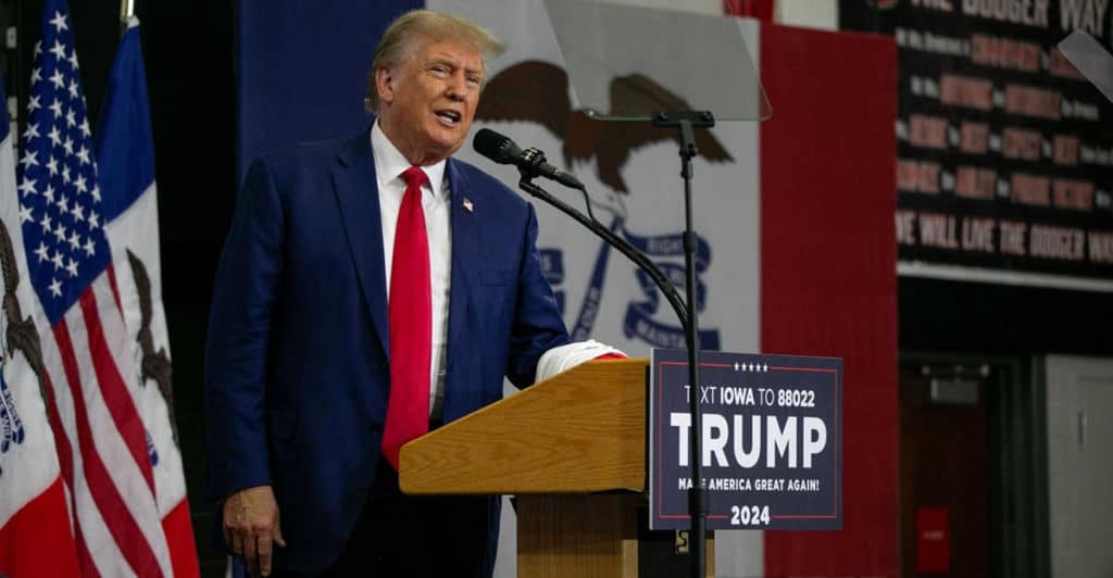 (アイオワ州フォートドッジ)無秩序に広がる農地と少数の風力発電所がある場所の近くで、ドナルド・トランプ前大統領は、中国、選挙の完全性、そして最近の裁判での勝利について、激しい演説を行った。